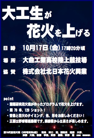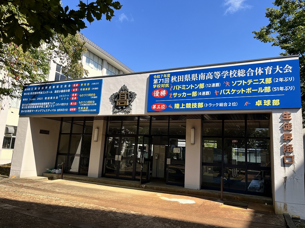 おしらせ 10月15日(水) ---「ソフトテニス部 全県新人大会で個人(山内、佐々木)1位となりました。」を更新しました--- 10月15日(水) ---「無線部 全県ARDF大会で団体2位、個人(今仲)1位、(熊谷)5位となりました。」を更新しました--- 10月14日(火) ---「『大工生が花火をげる』大工花火のポスター」を更新しました--- クリックでご覧ください 10月 8日(水) ---「『最近の部活動の活躍』ついて道路側に看板(全体、左)を取り付けました。」を更新しました--- クリックでご覧ください 10月 6日(月) ---「『最近の部活動の活躍』について看板(全体、左、右)を取り付けました。」を更新しました--- クリックでご覧ください 10月 6日(月) ---「学校行事」を更新しました--- ---「ふるさと企業紹介(1年)」を更新しました--- 10月 6日(月) ---「学校行事」を更新しました--- ---「地域清掃(1年)」を更新しました--- 10月 3日(金) ---「学校行事」を更新しました--- ---「大曲工業高等学校 大工祭の案内」を更新しました--- 9月26日(金) ---令和7年度「10月の行事予定」を更新しました--- 9月25日(木) ---「学校紹介」を更新しました--- ---「学校通信 No.6」を更新しました--- 9月22日(月) ---「学校行事」を更新しました--- ---「パテントコンテスト事前セミナー」を更新しました--- 9月22日(月) ---「水泳部 全県新人水泳スプリント選手権で50M背泳ぎ木元晴樹君が2位となりました。また、木元君は全県新人水泳100M・200M背泳ぎで4位となり東北新人水泳に出場となりました。」を更新しました--- 9月17日(水) ---令和8年度 秋田県公立高等学校入学者選抜についてを更新しました--- ---令和8年度「求める生徒像及び選抜方法等」についてを更新しました--- 令和8年度 入試情報を更新しました 9月16日(火) ---「吹奏楽部 秋田マーチングフェスティバル大会で優秀賞となり、東北大会(宮城県)に出場となりました」を更新しました--- 9月16日(火) ---「ソフトテニス部 県南新人大会で優勝(2年ぶり)、個人では山内・佐々木が優勝(2年ぶり)、小松田・進藤が3位で表彰されました」を更新しました--- 9月 8日(月) ---「サッカー部 県南新人大会で優勝(4連覇)しました」を更新しました--- 9月 1日(月) ---「部活動」を更新しました--- ---「主な大会成績」を更新しました--- 8月27日(木) ---「部活動」を更新しました--- ---「バドミントン部」を更新しました--- 8月26日(火) ---令和7年度「9月の行事予定」を更新しました--- 8月22日(金) ---「学校紹介」を更新しました--- ---「学校通信 No.5」を更新しました--- 7月28日(月) ---「学校行事」を更新しました--- ---「体験入学」を更新しました--- 7月26日(土) ---「学校行事」を更新しました--- ---「親子ものづくり教室」を更新しました--- 7月24日(木) ---令和7年度「8月の行事予定」を更新しました--- 7月19日(土) ---「学校行事」を更新しました--- ---「秋田県高校生ものづくりコンテスト2025『第20回測量部門』」を更新しました--- 7月18日(金) ---「学校紹介」を更新しました--- ---「学校通信 No.4」を更新しました--- 7月18日(金) ---「体験入学」を更新しました--- ---「令和7年度大曲工業高等学校「体験入学」について」を更新しました--- ---「令和7年度大曲工業高等学校「体験入学」への車での送迎について」を更新しました--- 7月18日(金) ---「図書便り」を更新しました--- ---「図書便り No.2」を更新しました--- 7月16日(水) ---「部活動」を更新しました--- ---「祝 全国大会出場」を更新しました--- 7月10日(木) ---「学校行事」を更新しました--- ---「若年者ものづくり競技大会秋田県代表選手壮行会」を更新しました--- 7月 9日(水) ---「学校行事」を更新しました--- ---「期日前投票」を更新しました--- 7月 9日(水) ---「学校行事」を更新しました--- ---「朝のあいさつ運動」を更新しました--- 7月 9日(水) ---「学校行事」を更新しました--- ---「野球応援練習」を更新しました--- 7月 3日(木) ---「学校行事」を更新しました--- ---「壮行会」を更新しました--- 7月 3日(木) --- 「部活動」を更新しました--- --- 「2025年度(令和7年度)大会成績」を更新しました --- 6月26日(木) ---「学校行事」を更新しました--- ---「ABSラジオ『みらいをつくろう!あきたの工業高校生』のラジオ取材」を更新しました--- 6月26日(木) ---令和7年度「7月の行事予定」を更新しました--- 6月25日(水) ---「学校行事」を更新しました--- ---「電気工事組合との交流会(電気科1年生)」を更新しました--- 6月25日(水) ---「コミュニティ・スクール 学校運営協議会」を更新しました--- ---「第1回 学校運営協議会 (議事録)」を更新しました--- ---「CS通信 ~ 地域とともにある学校づくり ~ No.1」を更新しました--- 6月24日(火) ---「学校紹介」を更新しました--- ---「学校通信 No.3」を更新しました--- 6月24日(火) ---「親子ものづくり教室」を更新しました--- 令和7年度 「親子ものづくり教室」の要項を更新しました 6月16日(月) ---「学校行事」を更新しました--- ---「成年年齢引下げに伴う消費者教育(3年生)」を更新しました--- ---「基本マナー講習(2年生)」を更新しました--- --